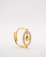 Τιμή μονάδας ανάStep into elegance with the Golden Orbit Statement Ring, a luxurious blend of modern design and timeless sophistication. This unique open-ring features a dazzling oval centerpiece adorned with sparkling white stones, encircling a delicate floating teardrop charm that moves gracefully with every motion.
