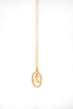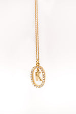 A timeless and elegant gold-plated necklace featuring a sparkling oval frame adorned with zirconia stones, encasing a delicate letter "K" charm. This pendant is a perfect personalized accessory, ideal for adding a special touch to your everyday style or as a meaningful gift for someone special.