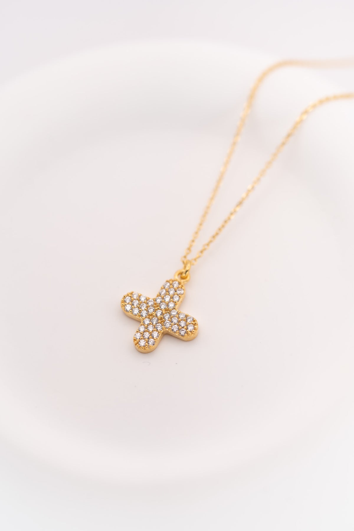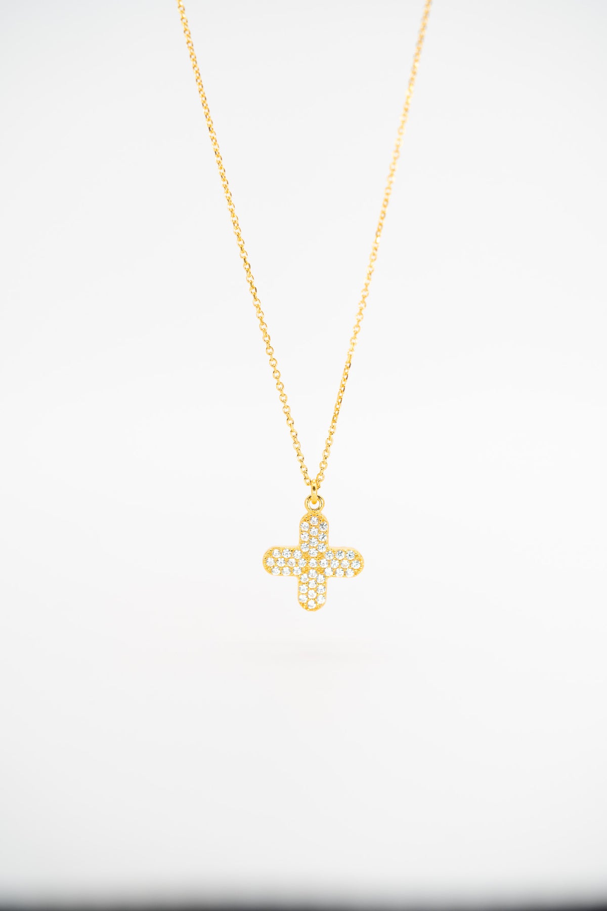 A symbol of faith and elegance, the Radiant Cross Pendant Necklace is a timeless piece that blends spiritual meaning with sophisticated sparkle. Crafted with gold-plated metal, this delicate cross is adorned with shimmering zirconia stones, reflecting light beautifully with every movement. A graceful expression of devotion, this necklace is perfect for daily wear or special occasions.