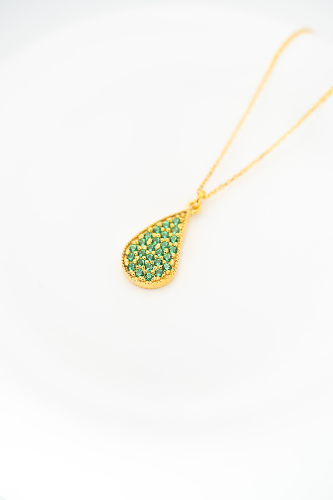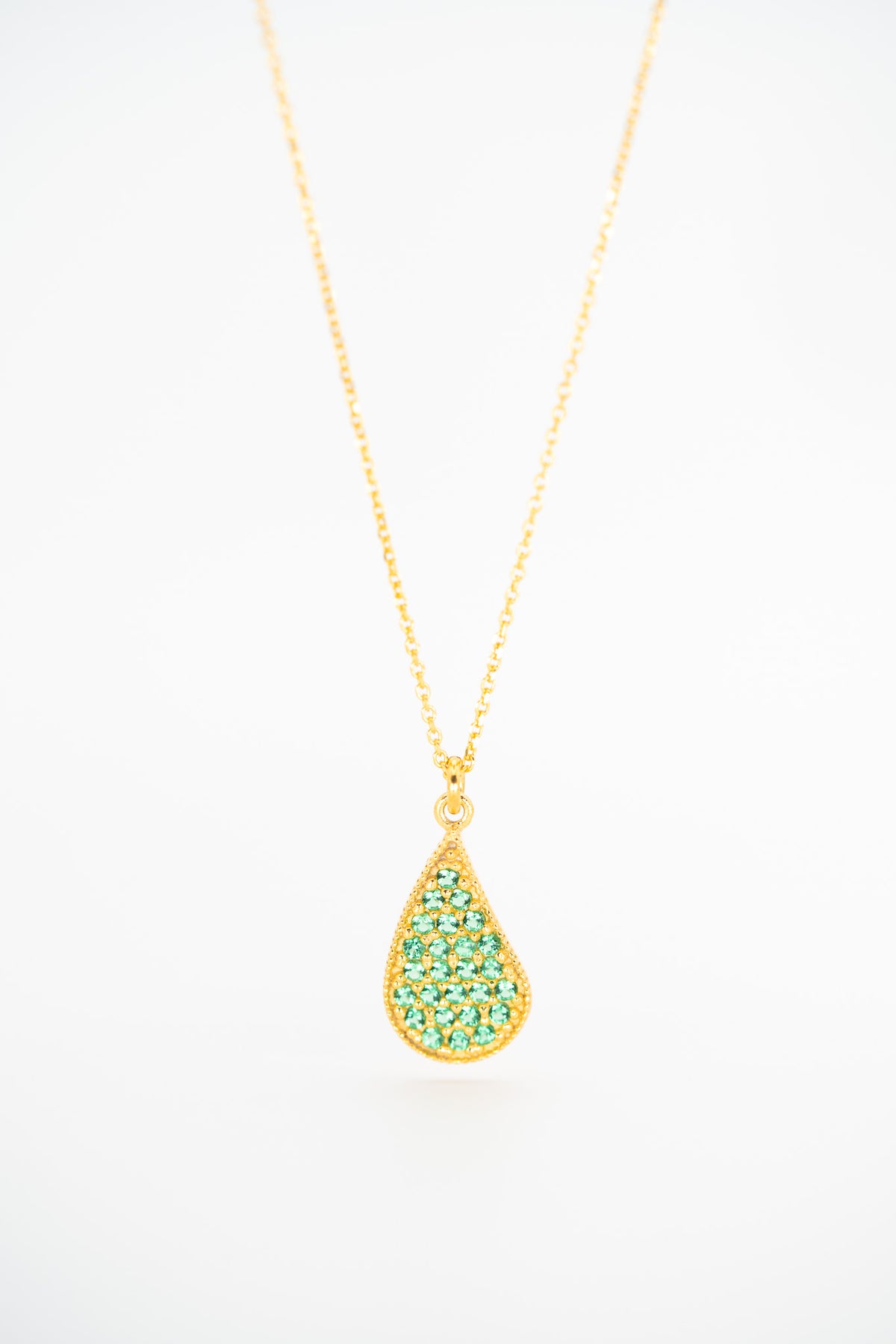 A symbol of renewal and elegance, the Emerald Radiance Teardrop Pendant is crafted to shine with sophistication. Featuring a pavé of dazzling green zirconia stones, this pendant is set in a luxurious gold-plated finish, creating a timeless yet modern look.