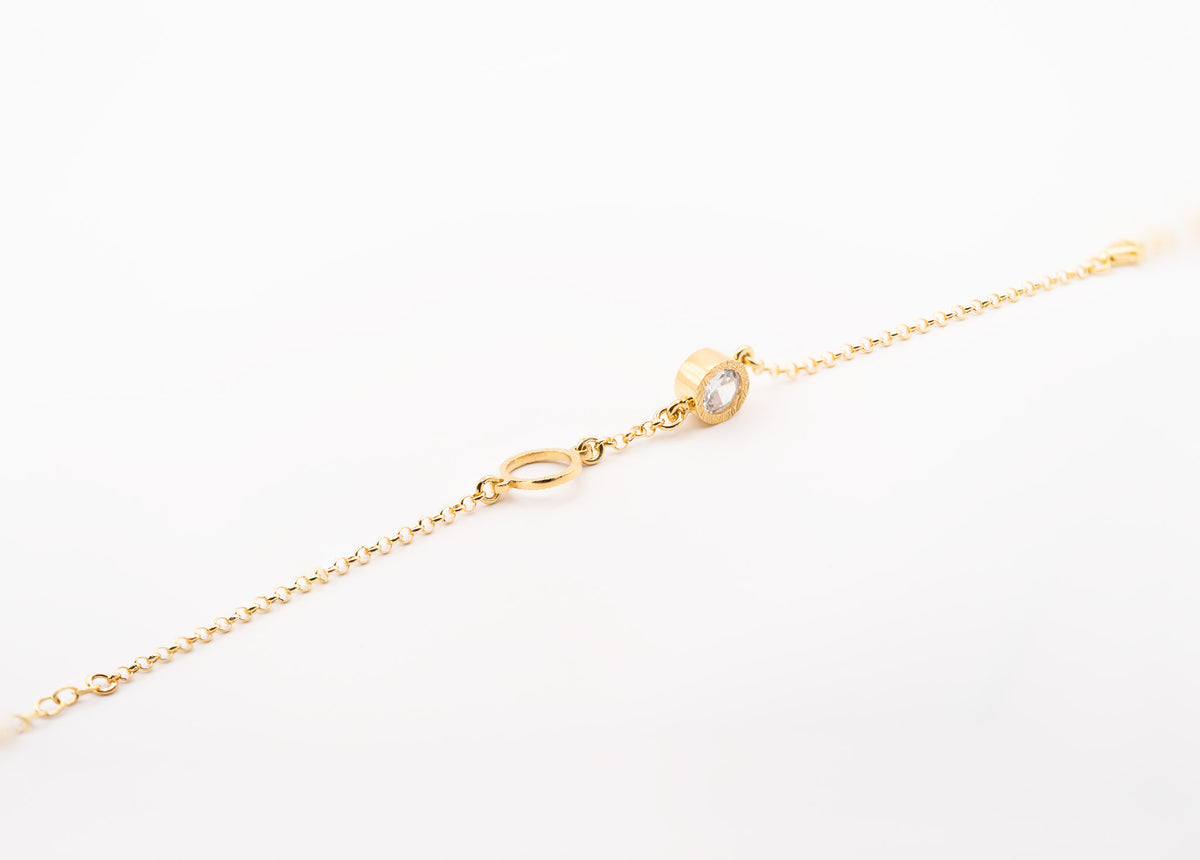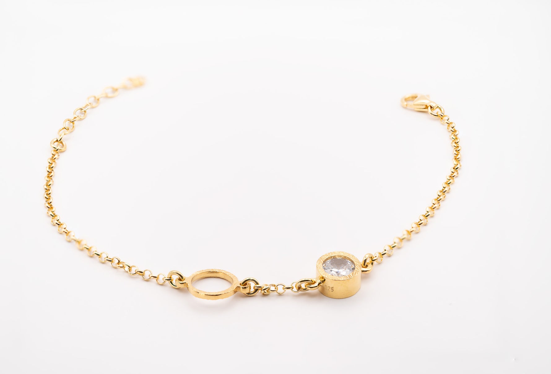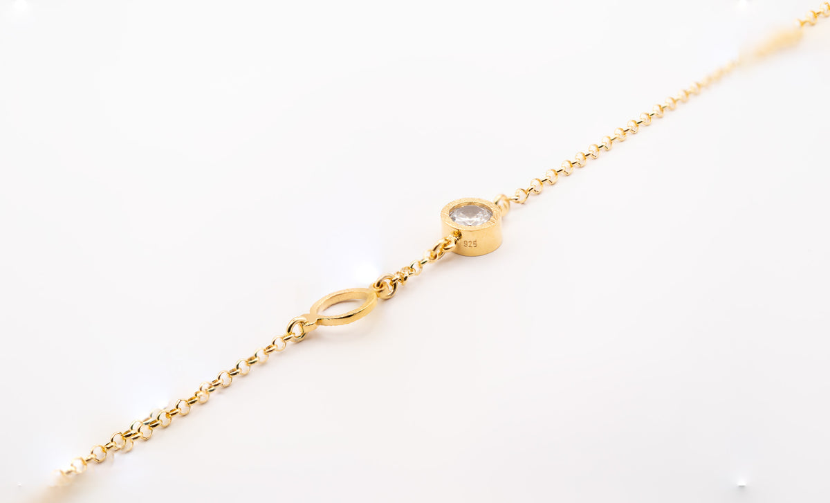 Unit price perThe Golden Harmony Zirconia Bracelet embodies elegance and balance, featuring a 925 sterling silver base plated in radiant gold. Its delicate chain is adorned with a textured open circle and a brilliant white zirconia stone, symbolizing clarity and harmony. This exquisite piece is perfect for adding a subtle sparkle to your daily ensemble or elevating your evening look.